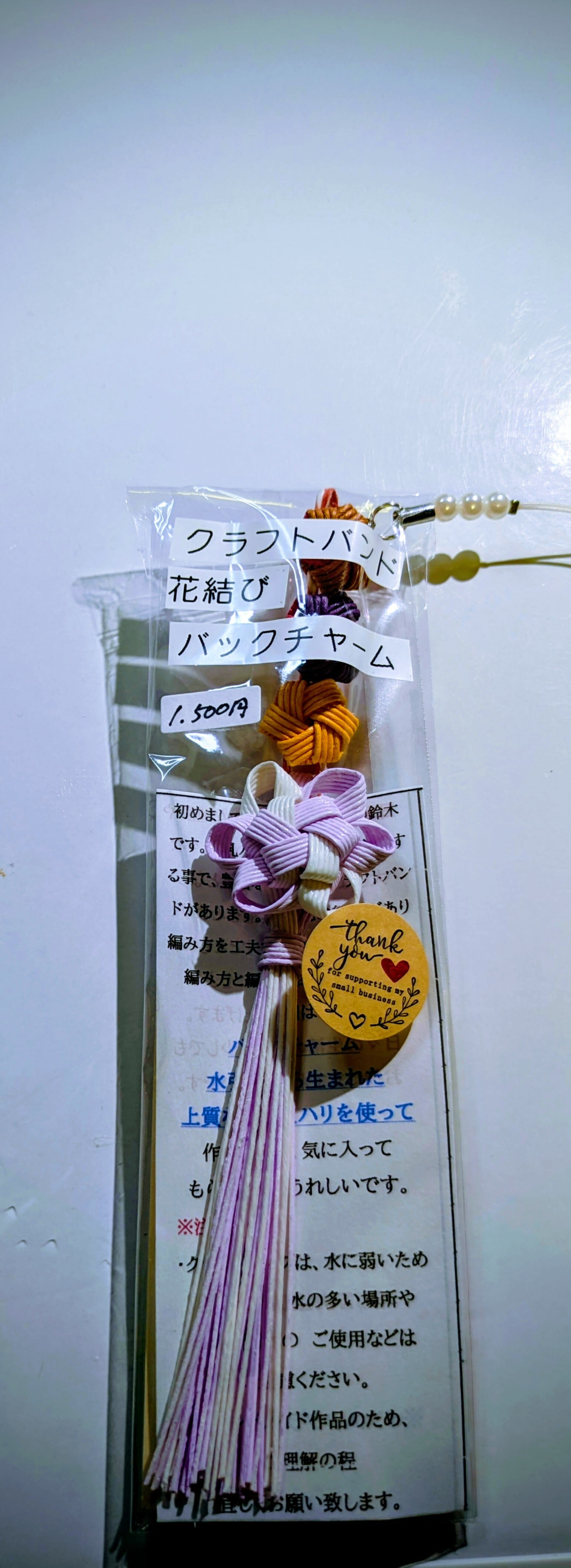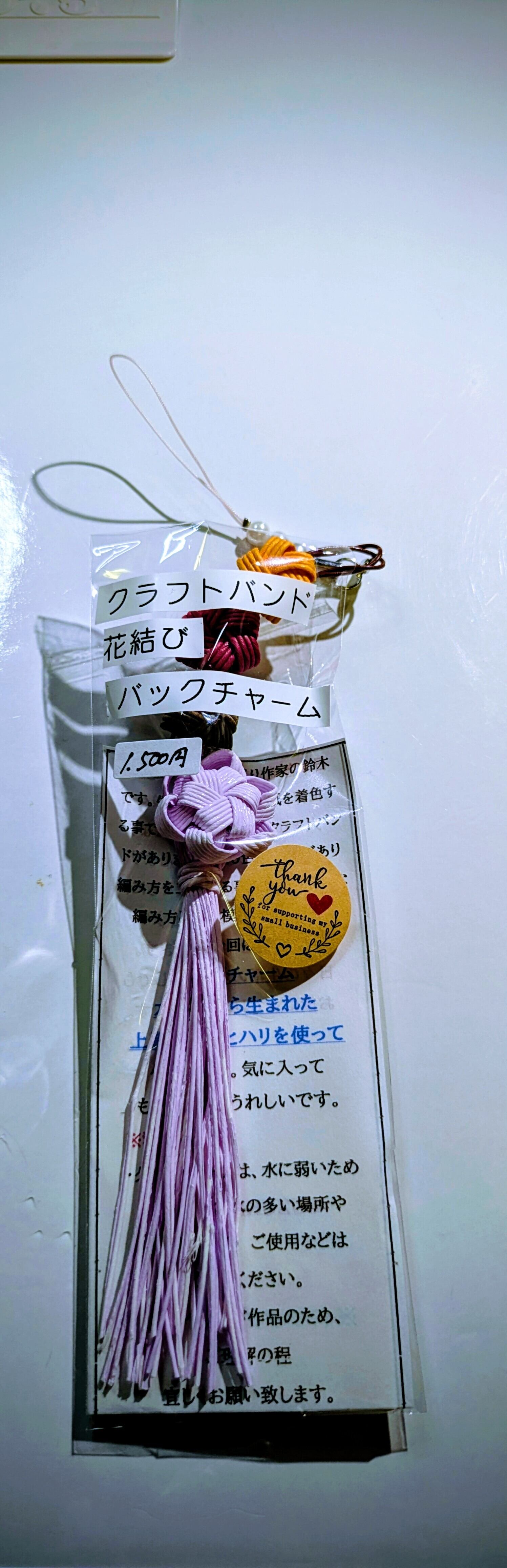 クラフトバンドで、バッグチャームを作り、花結びも付けました