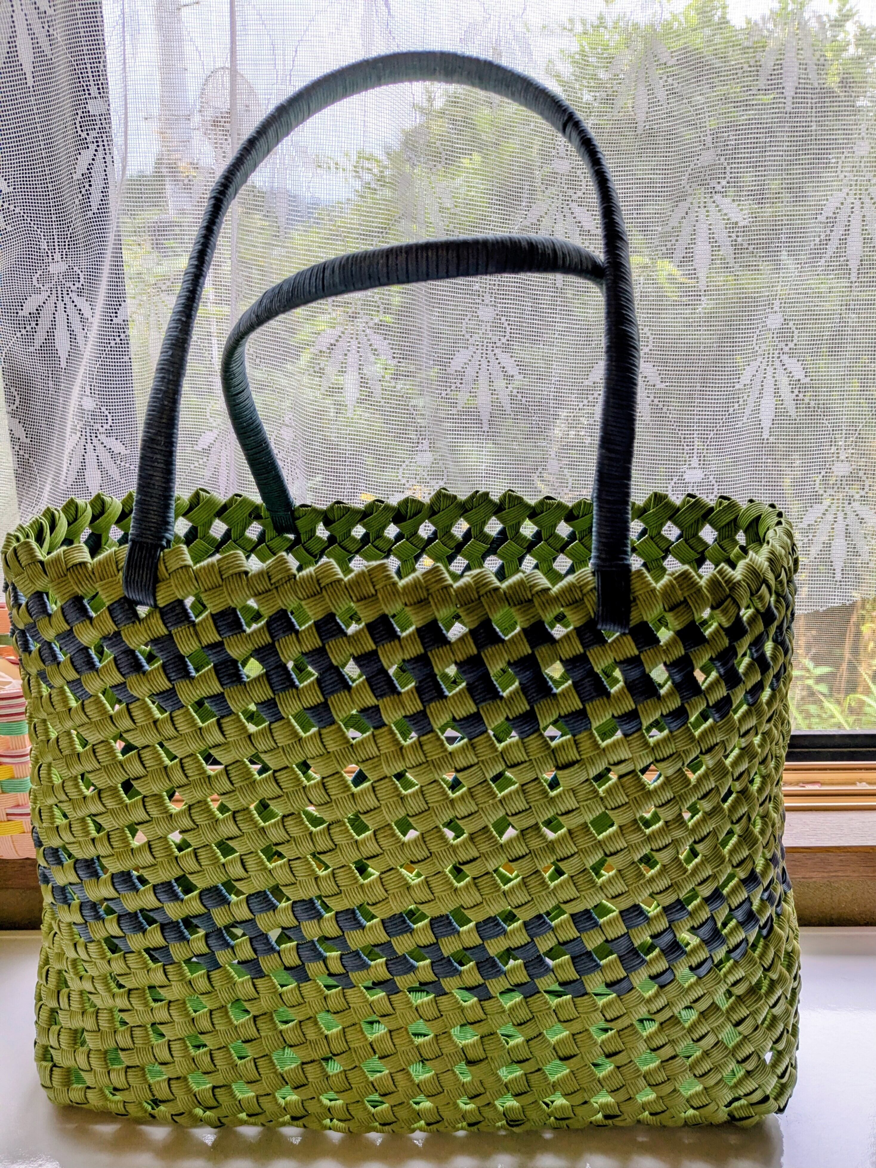 四つだたみ編みの技法を使ったこのカラフルバッグは、個性あふれるデザインで、どんなシーンにもマッチします! バンブーの取っ手を付けました。