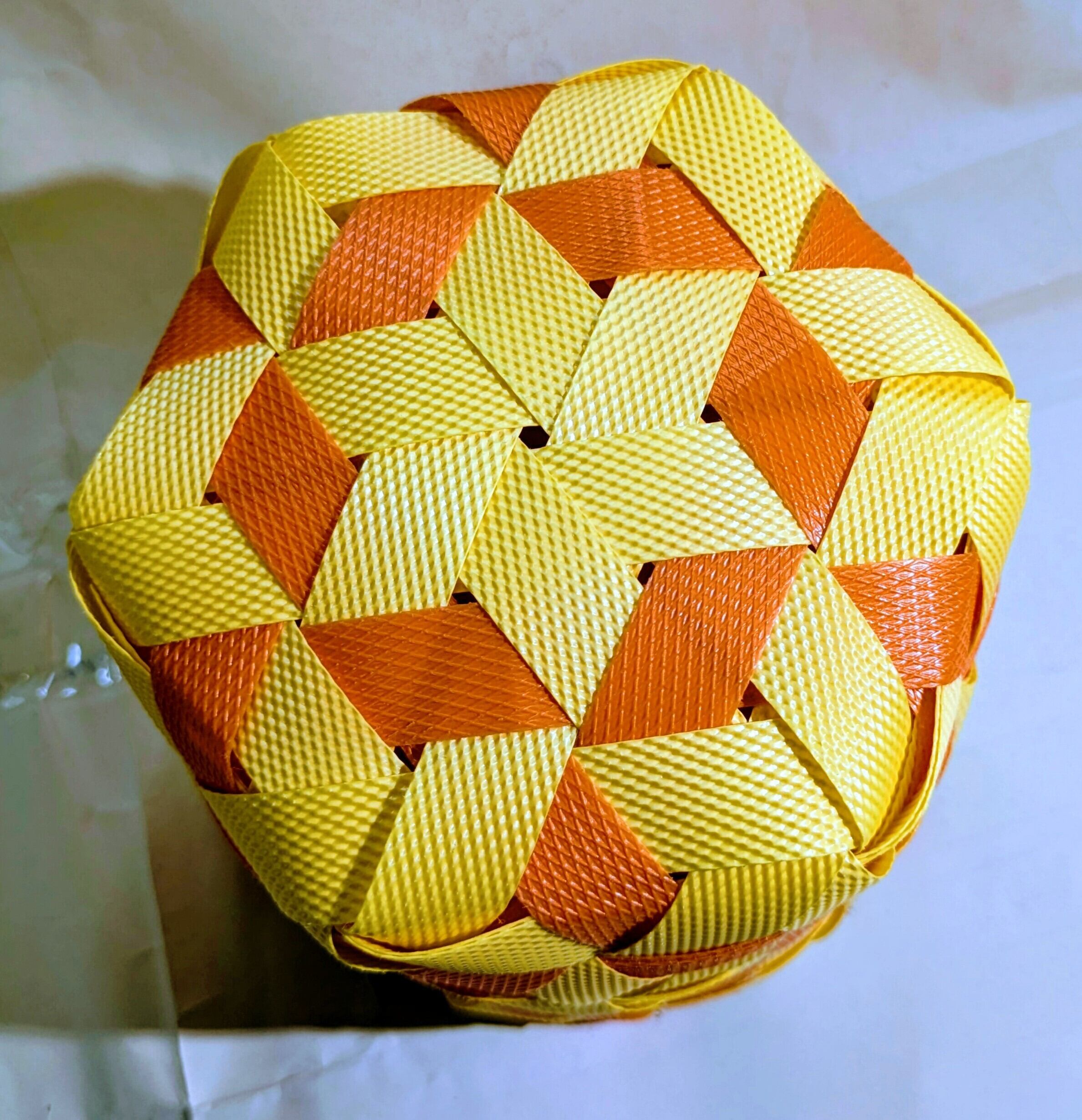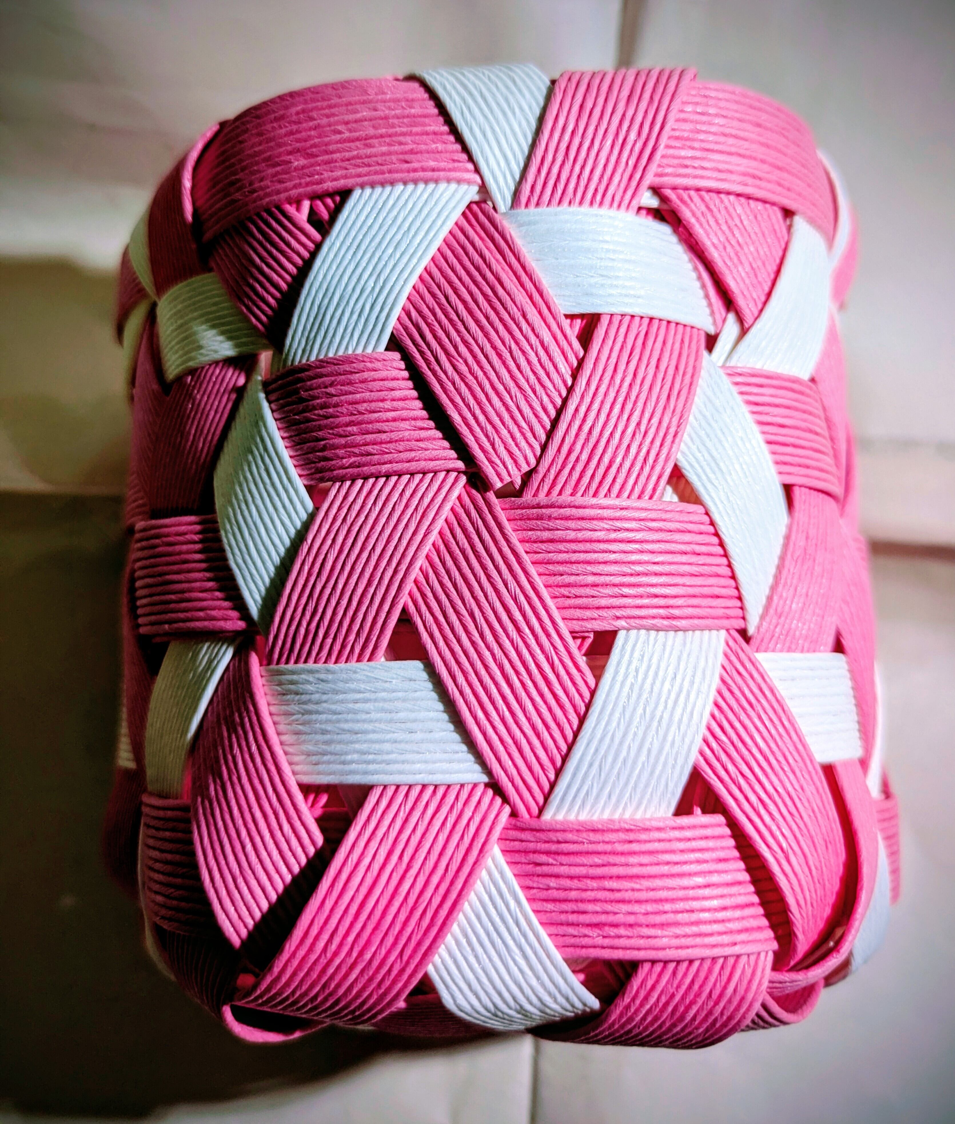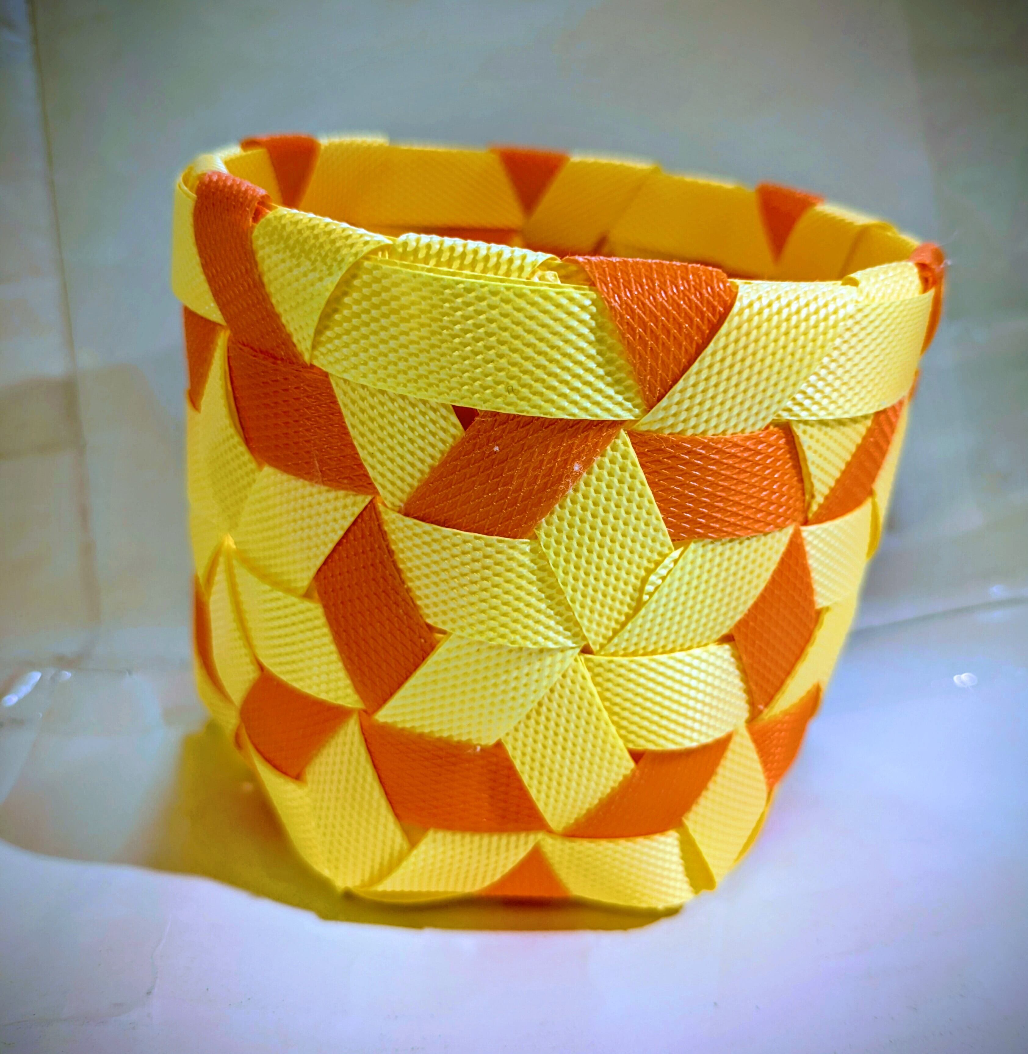 PPバンドで作った星模様のかごは、軽くて丈夫・扱いやすいく、汚れても洗えて清潔感たっぷりなペン立てです。正六角形の形から星模様に見えます。